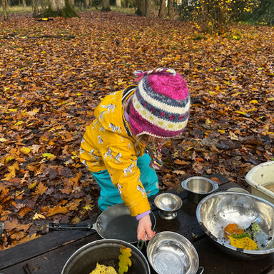 Our sessions are play-based and child-led, with activities such as sensory play, water play, mud kitchen play, potion making, play dough, painting, natural crafts, exploring the woods, nature ID and scavenger hunts. One of the children's favourite activities during the Summer is playing in the stream, spotting fish and other creatures. There are often a crayfish and trout in the stream.